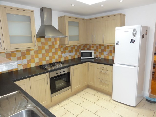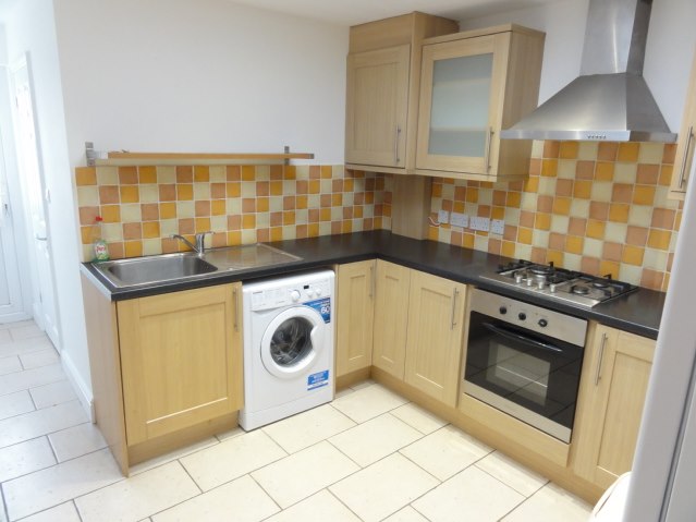 9’11 x 10’8 Fitted modern kitchen with storage base units, storage wall mounted units, Stainless steel sink unit water mixer tap, Gas cooker hob, Electric oven, extractor hood, ample power points, ceiling light, ceramic tiled floor, ceiling spot lights, plumbed for washing machine, space for fridge freezer, wall mounted Gas central heating boiler