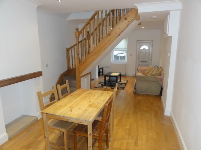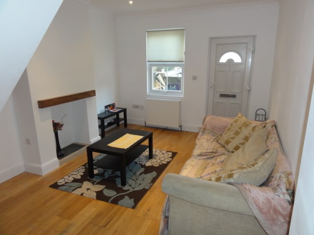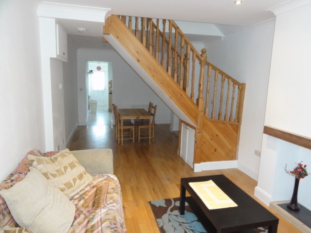 25’06 x 10’07 Spacious living room with laminate wood floor, double power points, double glazed front aspect window, two double radiators, 2 fire places, BT point, central heating thermostat, wall mounted cupboard housing utility meters, stairs leading to first floor bedrooms, access to rear kitchen and ground floor bathroom